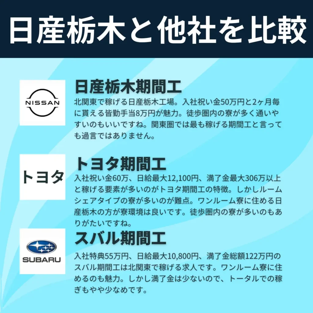 同じ北関東にはスバル期間工もありますが、稼ぎの面では日産栃木工場の方が稼げるでしょう。