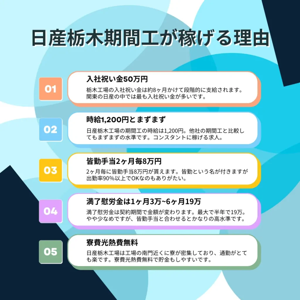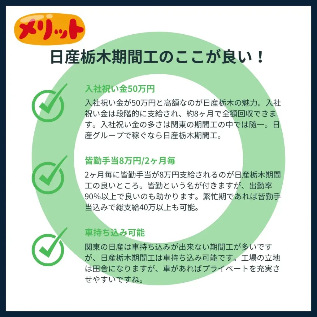 入社祝い金や2ヶ月毎に貰える皆勤手当が魅力の日産栃木期間工。