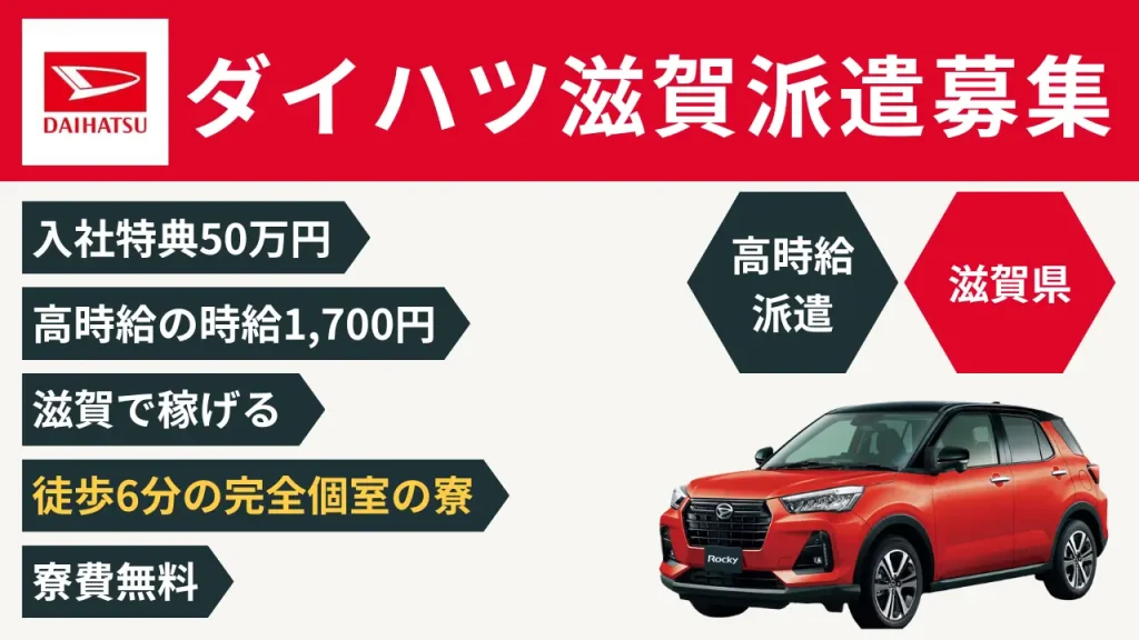 ダイハツ滋賀工場では入社特典50万円、時給1,700円、月収例41万円と稼げる工場派遣求人があります。