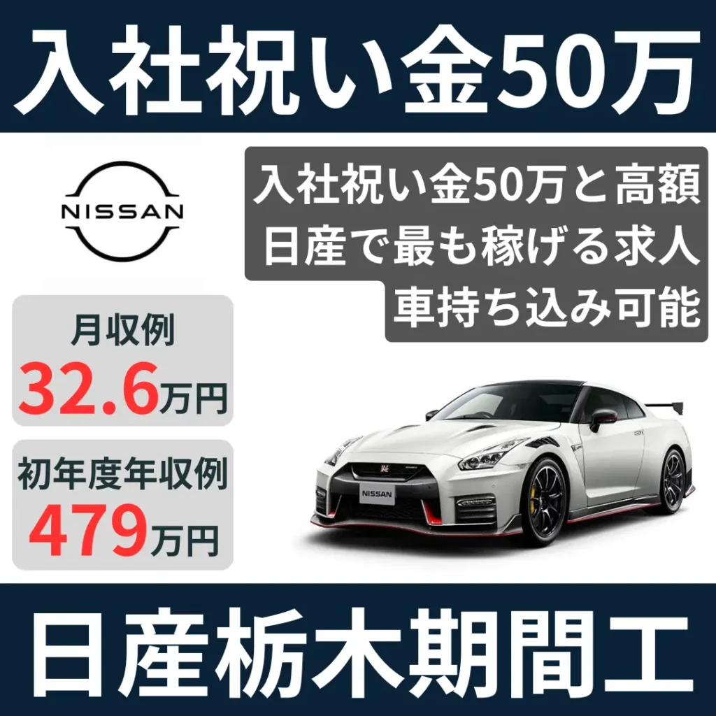 >>【入社祝い金50万】日産栃木期間工は初年度年収500万を狙える稼げる期間工
