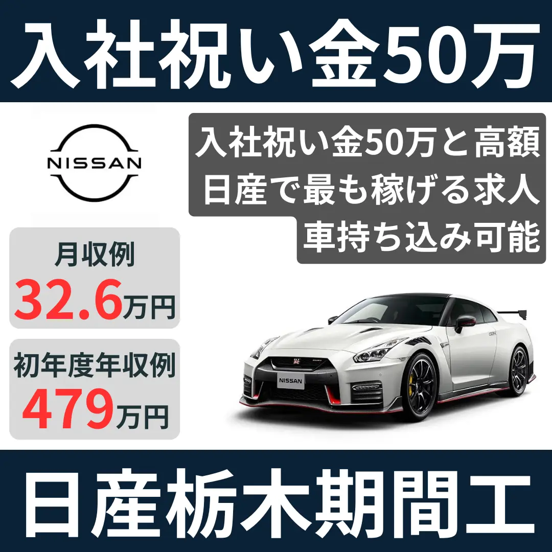 【4月より応募開始予定】入社祝い金50万円の日産期間工栃木工場