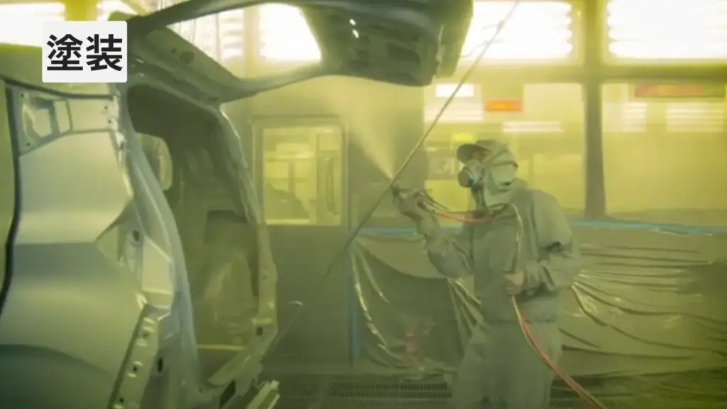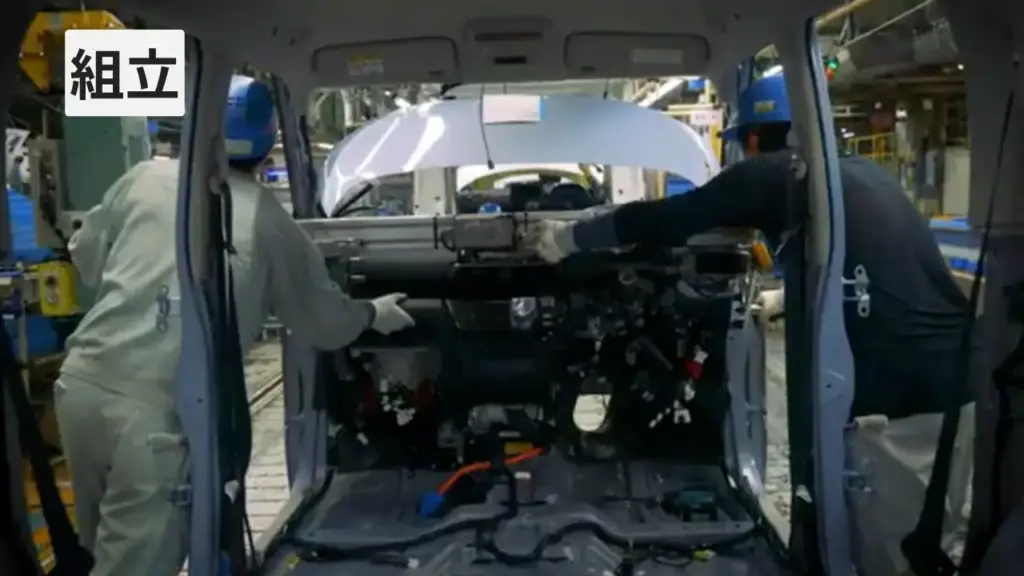 インパクトドライバーなどの工具を使い、自動車を組み立てる工程です。